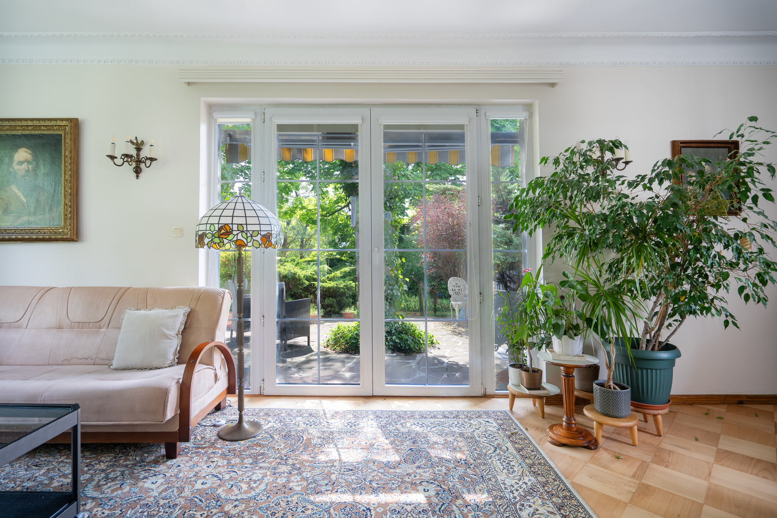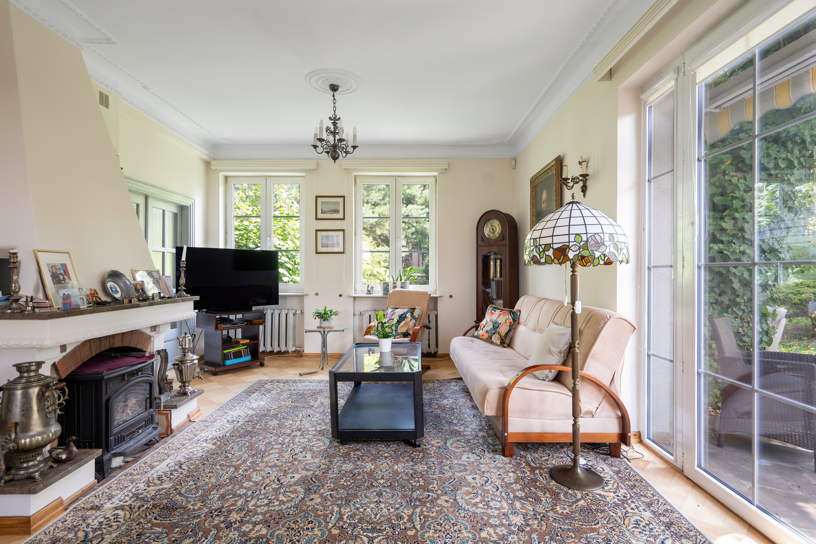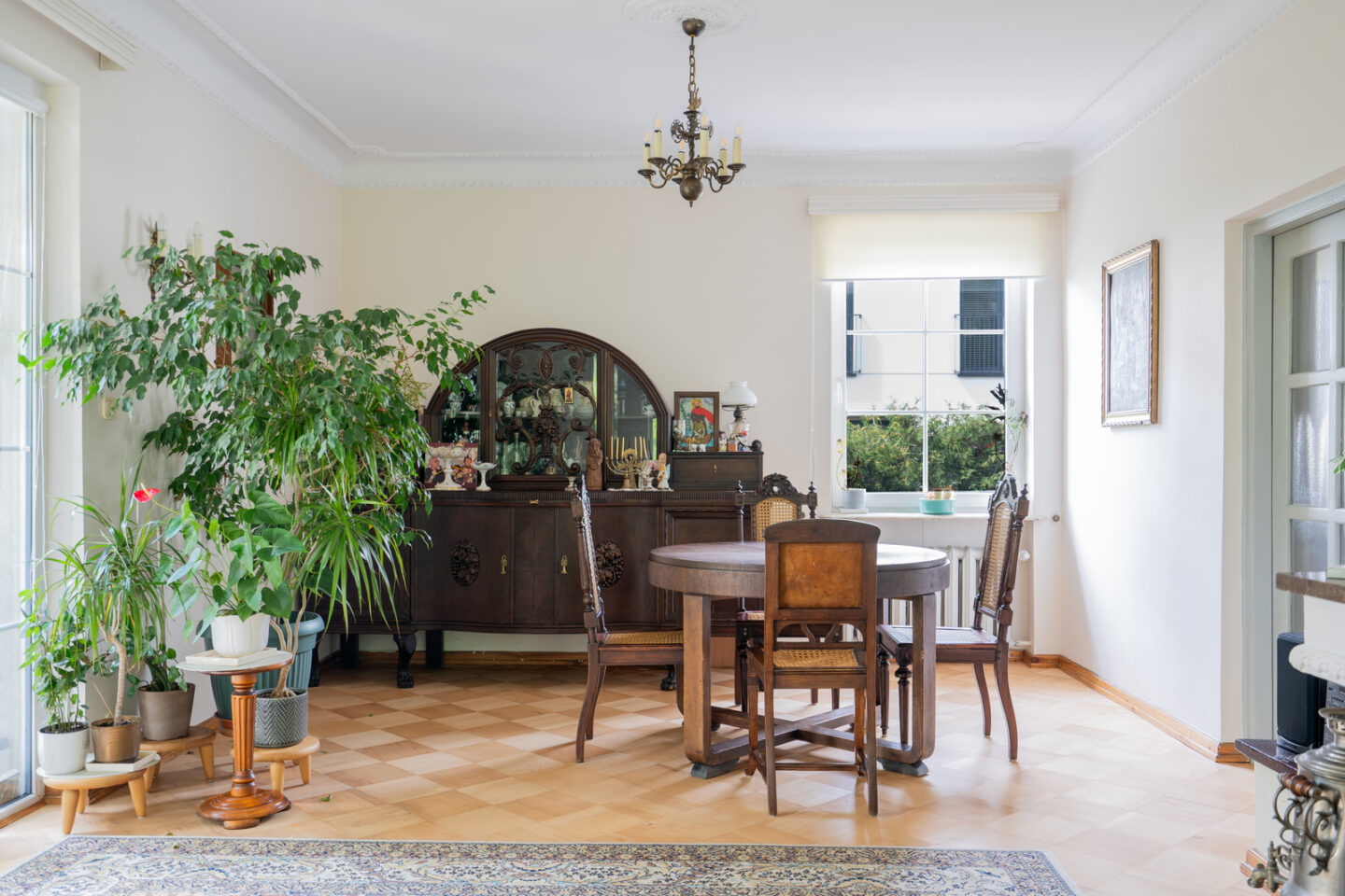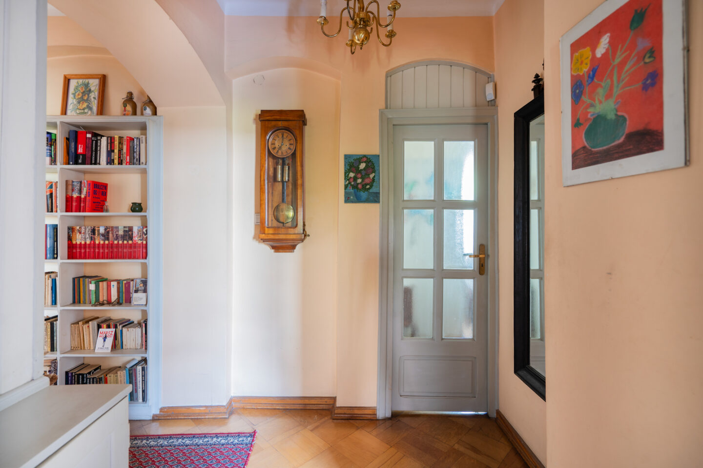 Parter domu ma klasyczny charakter. Duże okna zapewniają dopływ światła i sprawiają, że każde pomieszczenie dobrze doświetlone i jasne. Drewniane podłogi oraz antyczne meble nadają domowi charakteru. To wszystko stanowi dobrą bazę do własnej aranżacji domu.