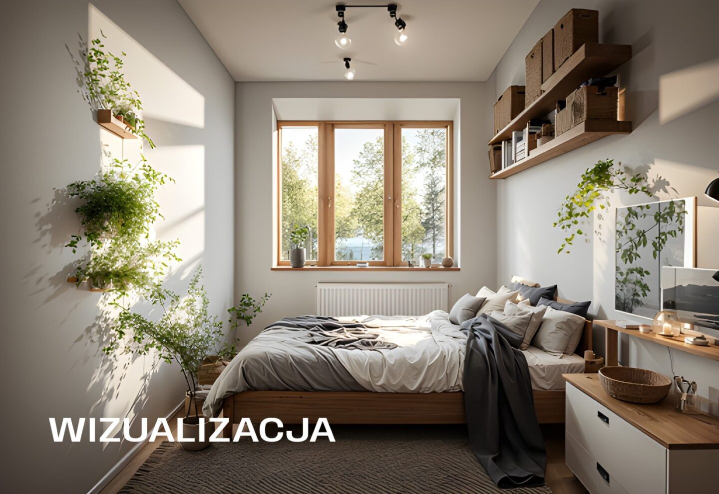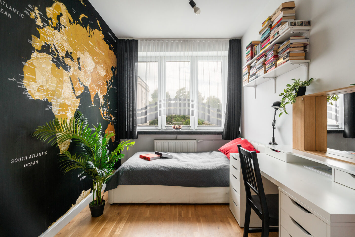 Sypialnia: Sypialnia o powierzchni 11 m² została zaprojektowana z myślą o komforcie i relaksie. Znajduje się tu duże łóżko z pościelą w stonowanych kolorach, co sprzyja wypoczynkowi. Ciekawym elementem dekoracyjnym jest mapa świata na ścianie, która dodaje wnętrzu charakteru. Półki na książki oraz przestronne biurko sprawiają, że pokój ten jest również idealnym miejscem do pracy. Okna sypialni wychodzą na południowy wschód, co zapewnia dużo naturalnego światła i słoneczne poranki.