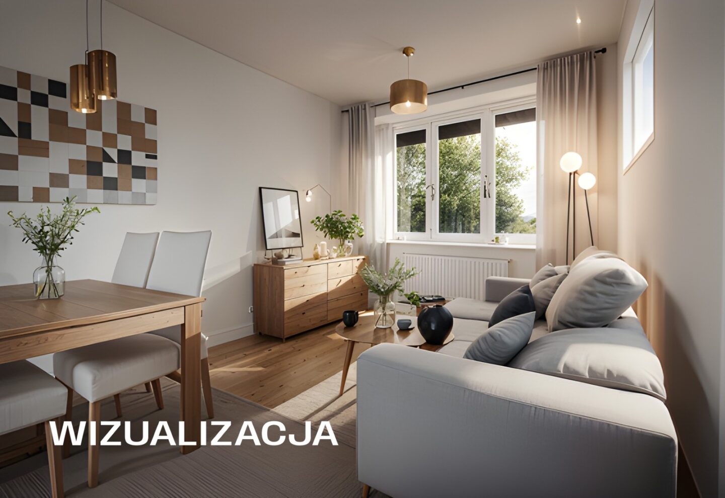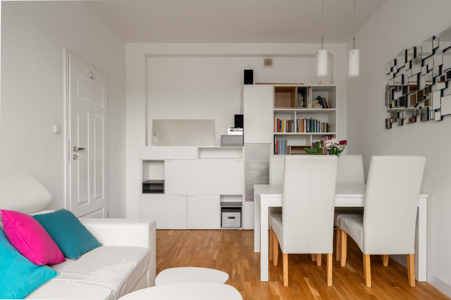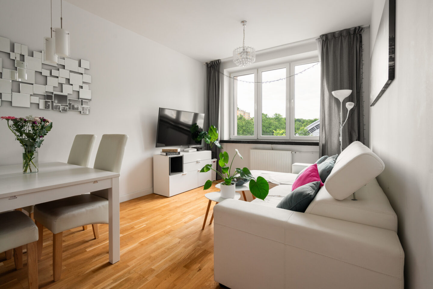 Salon z aneksem jadalnym: Przestronny salon o powierzchni 17,5 m² jest sercem tego mieszkania. Z Jasne, drewniane podłogi doskonale komponują się z białymi meblami, tworząc przytulną atmosferę. Aneks jadalny, z eleganckim stołem i białymi krzesłami, stanowi idealne miejsce do spożywania posiłków i spotkań z bliskimi. Duże okna zapewniają dużo naturalnego światła oraz widok na zieleń. Okna salonu wychodzą na północny zachód, co zapewnia przyjemny chłód w letnie popołudnia.