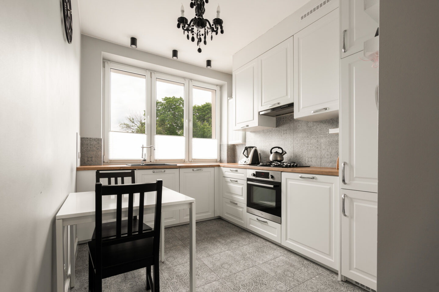 Kuchnia: Kuchnia to połączenie funkcjonalności i elegancji o powierzchni 8 m². Białe, nowoczesne szafki z drewnianymi blatami oraz wysokiej jakości sprzęty AGD tworzą przestrzeń, w której gotowanie staje się prawdziwą przyjemnością. Stylowe płytki na ścianach i podłodze nadają kuchni wyjątkowego uroku. Okna kuchni również wychodzą na północny zachód, co zapewnia przyjemny, równomierny rozkład światła w ciągu dnia.