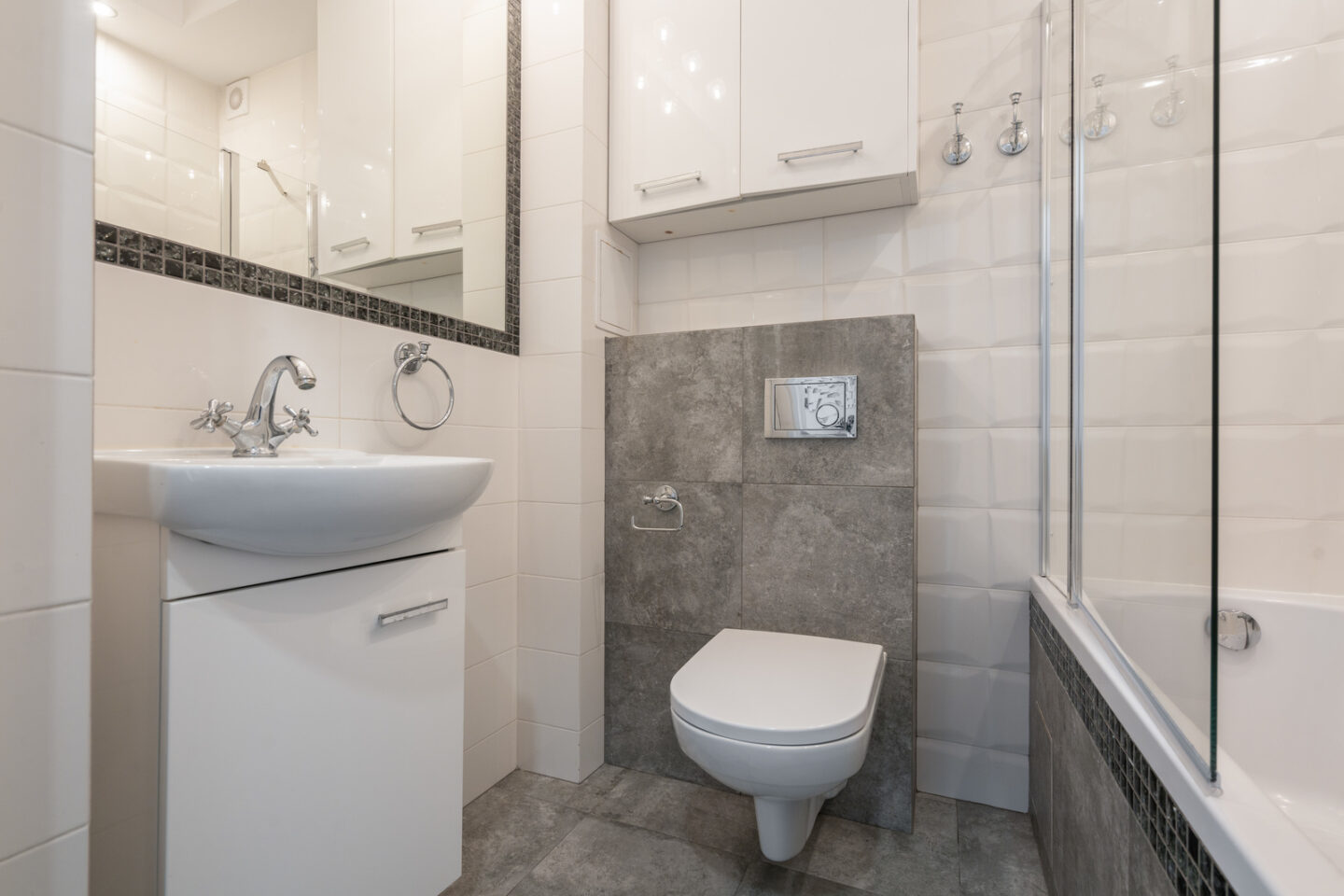 Łazienka: Łazienka jest nowocześnie urządzona, z dbałością o każdy detal. Białe płytki, elegancka umywalka i praktyczne szafki zapewniają komfort i wygodę. Przestronny prysznic oraz wanna sprawiają, że jest to idealne miejsce do relaksu po ciężkim dniu.