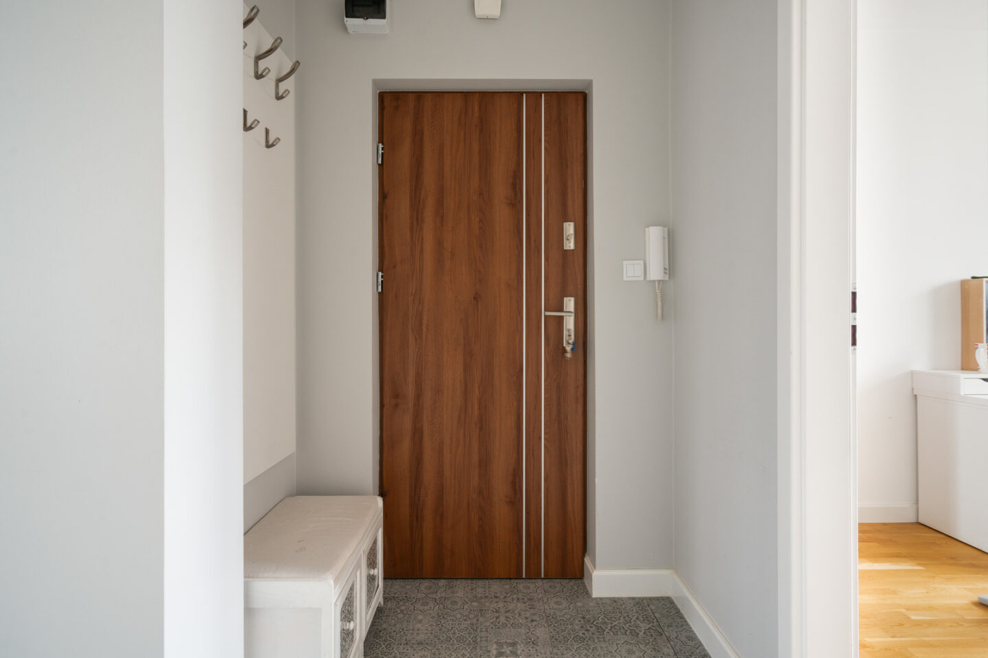 Przedpokój: Przedpokój jest jasny i przestronny, z praktycznymi wieszakami na ubrania oraz miejscem do przechowywania. Solidne drzwi wejściowe zapewniają bezpieczeństwo i prywatność.