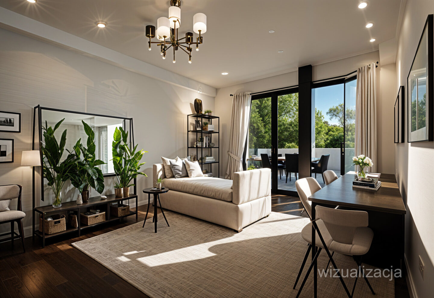 * balkon ze wschodnią ekspozycją oraz widokiem na zieleń